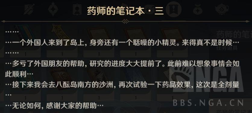 首先根据纸条三,我们可以找到他最后的踪迹,一个宝箱以及一筐鸣草和一个成就。大概最后开发不成功把自己药死了……