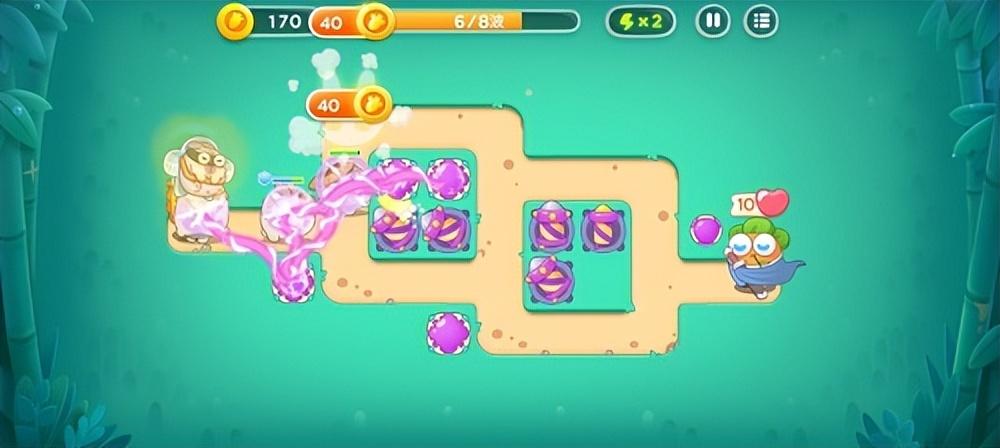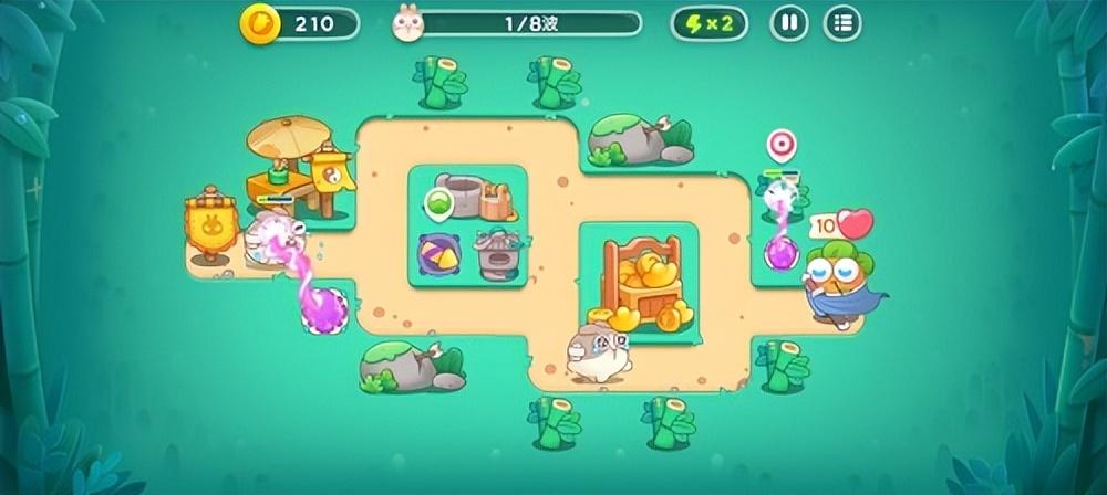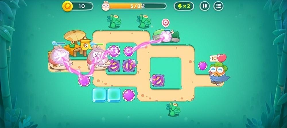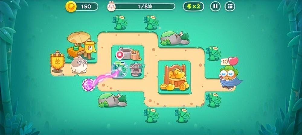 3、用赚到的金币在竹子留下的空位放置一个导弹塔,然后再阿波的旁边设置一个魔法球用来阻拦怪物。