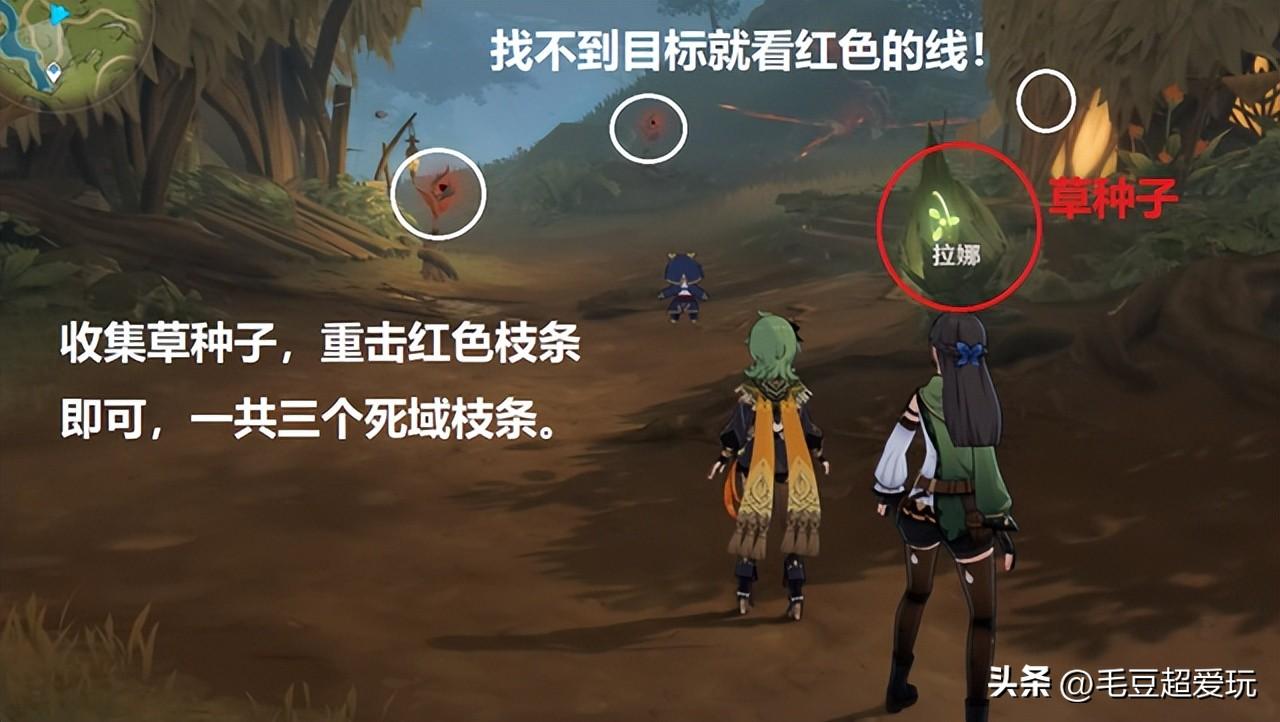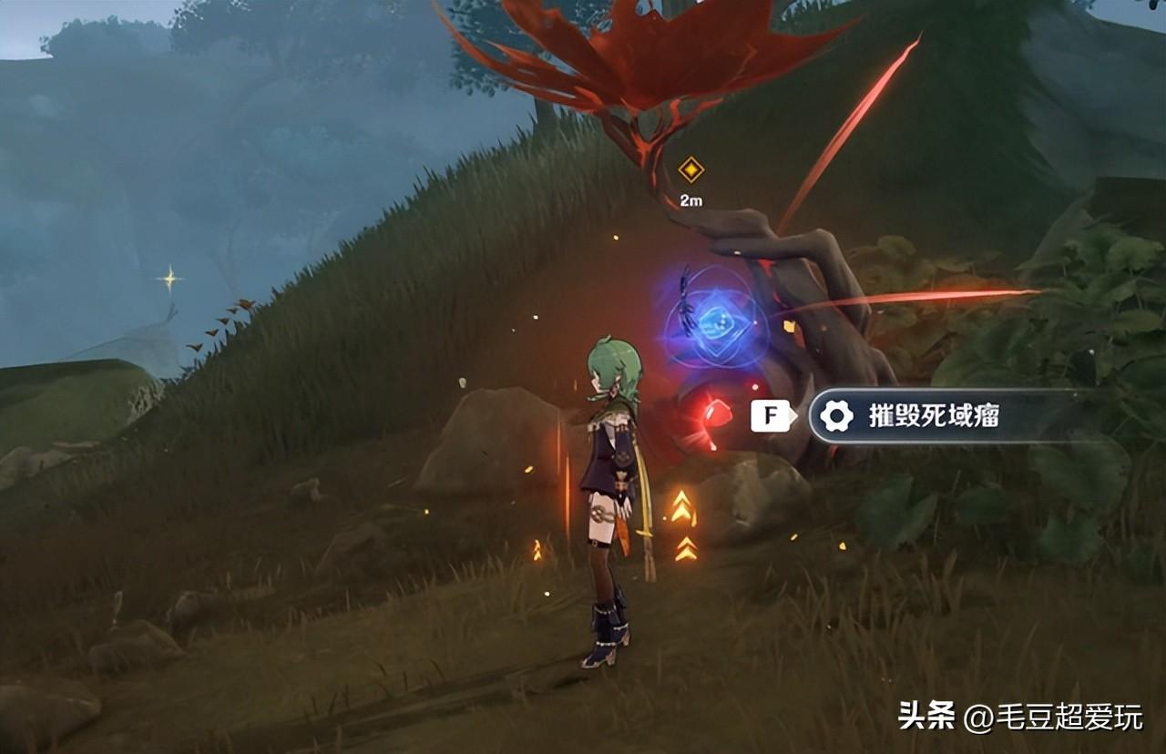 这次的任务没有太多难点,主要还是破坏死域,我们需要利用草种子重击死域内的红色枝条,三个枝条都摧毁后就可以摧毁死域瘤,小伙伴们如果找不到红色枝条也可以通过死域瘤的“红色线”找到需要重击的目标,值得注意的是枝条被破坏后会发射箭矢,摧毁死域瘤后还会出现一只怪物!
