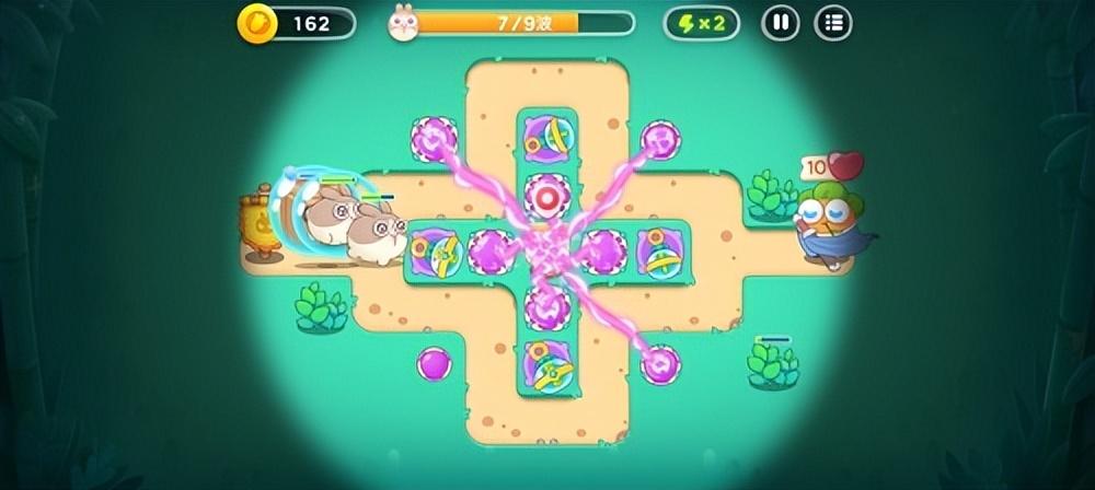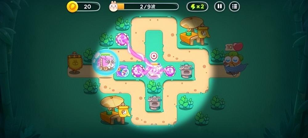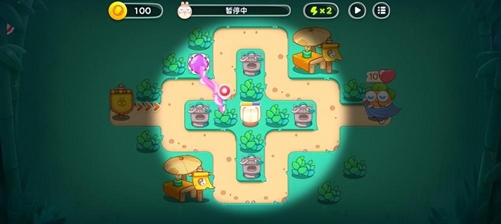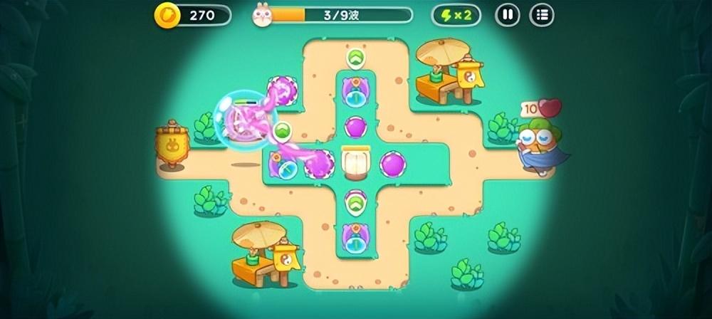 2、再次放置一个魔法球,然后开始清理旁边的石塔,放置一个泡泡塔用来减速怪物。然后我们就可以在怪物进攻的间隙时间中为祈天灯充能啦。