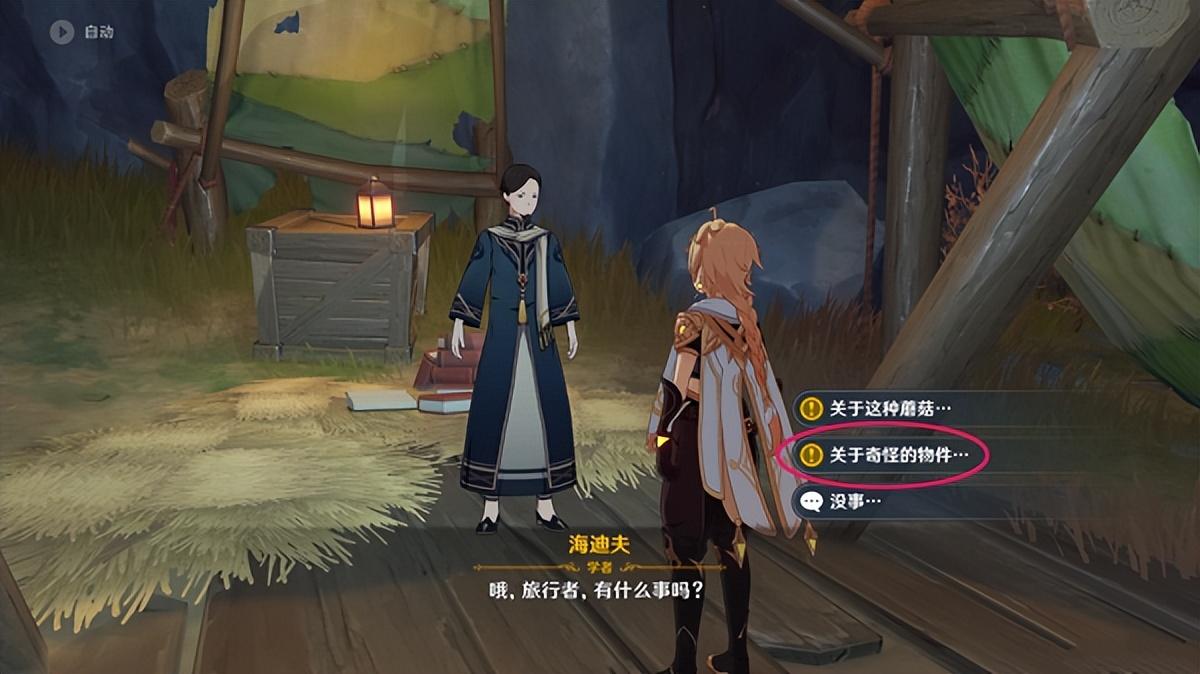 钓到任务道具「奇怪的物件」后,我们回到营地找学者海迪夫对话,选择选项「关于奇怪的物件…」
