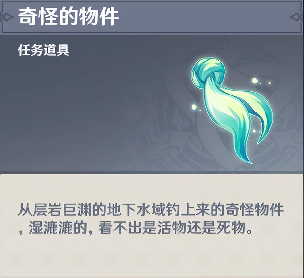 在地下水泽图示位置,有一处钓鱼点,在这里钓鱼有概率会在钓上鱼的同时钓到任务道具「奇怪的物件」。钓上这个道具即可触发任务。