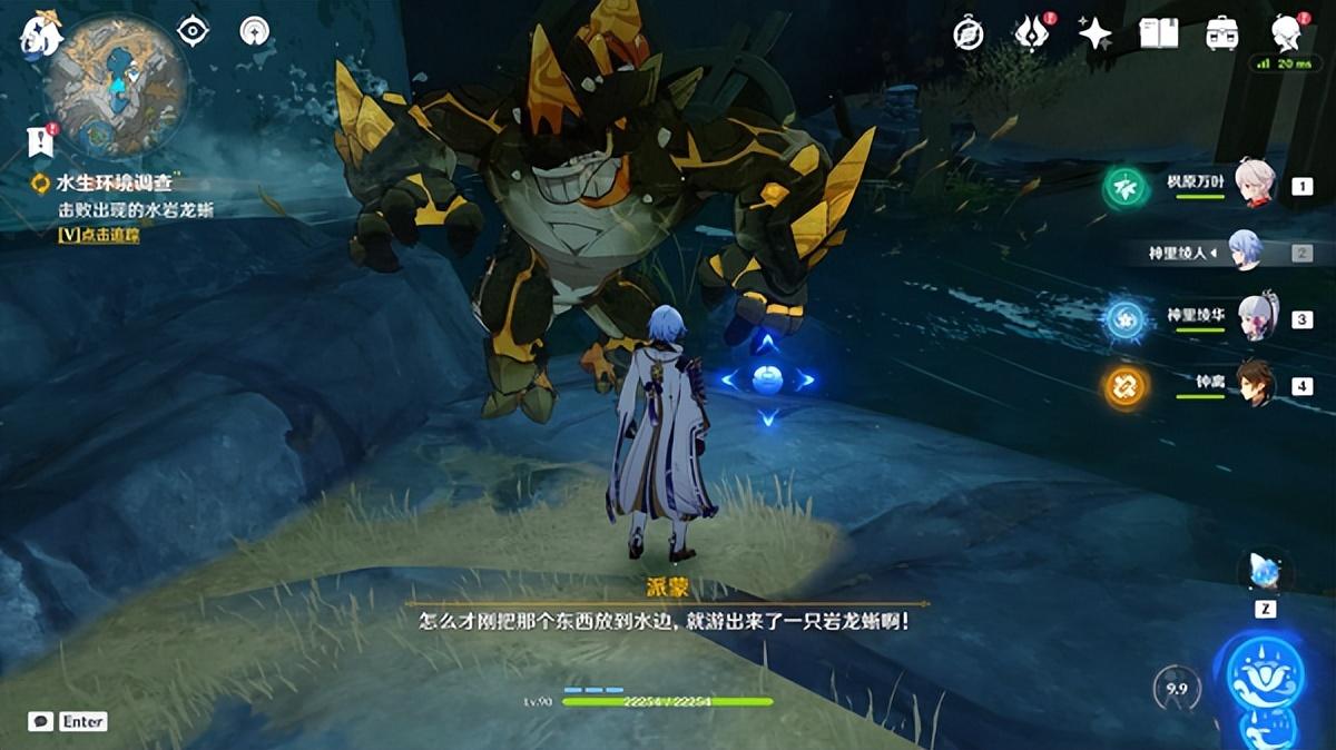 利用水元素反应激活后,突然冒出了一只水属性的岩龙蜥,这难道就是这个奇怪物件的效果吗?将魔物击败,我们回去向海迪夫回报吧。