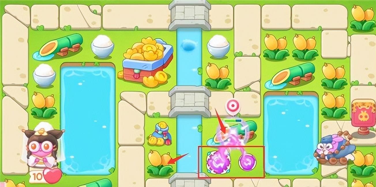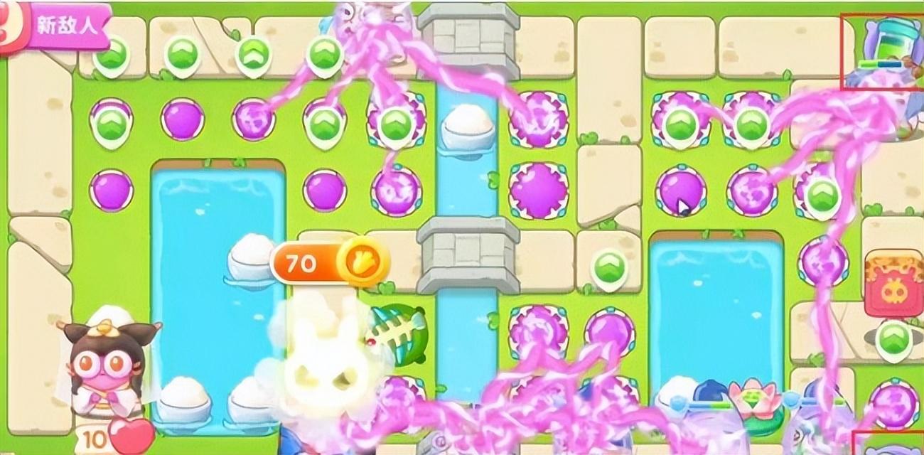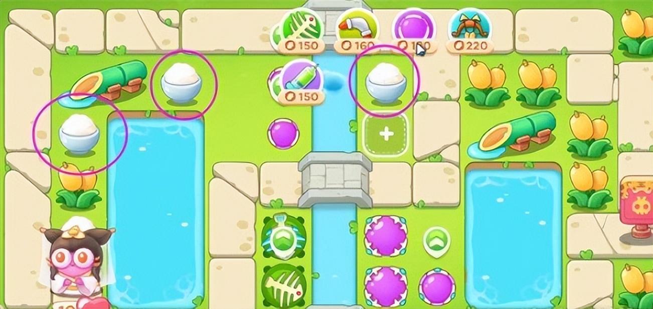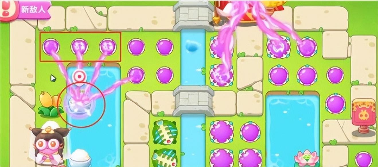 5、第四波开始的时候就把序号1魔法球升级,打掉米饭,接着放置序号2魔法球,右边图开出来后再放置两个魔法球,同时这两个魔法球接着打附近的道具。