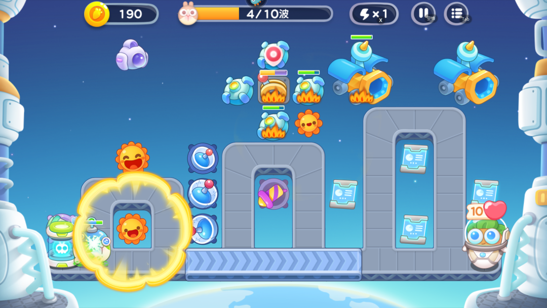 后续几波多建造雷达和导弹塔即可。记得在出口处建造毒针,本关的滑板兔速度快容易冲破防线,而且炮塔不会优先攻击滑板兔,因此需要我们手动点滑板兔优先攻击。
