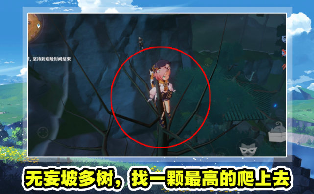 无妄坡的地形也相对比较简单,如果正常躲藏肯定很容易被发现,但是无妄坡自带阴天,光照度很低,远处和高处的视野非常模糊,刚好无妄坡又有很多树,长得还特别高,所以推荐玩家直接找一颗最高的爬上去,就像上图这样,猎人在下方很难看清,即使看到了,想要抓捕游侠也非常困难,必须爬到树上才能抓,如果我们看到游侠过来了,马上飞下去,然后隐身跑走即可。