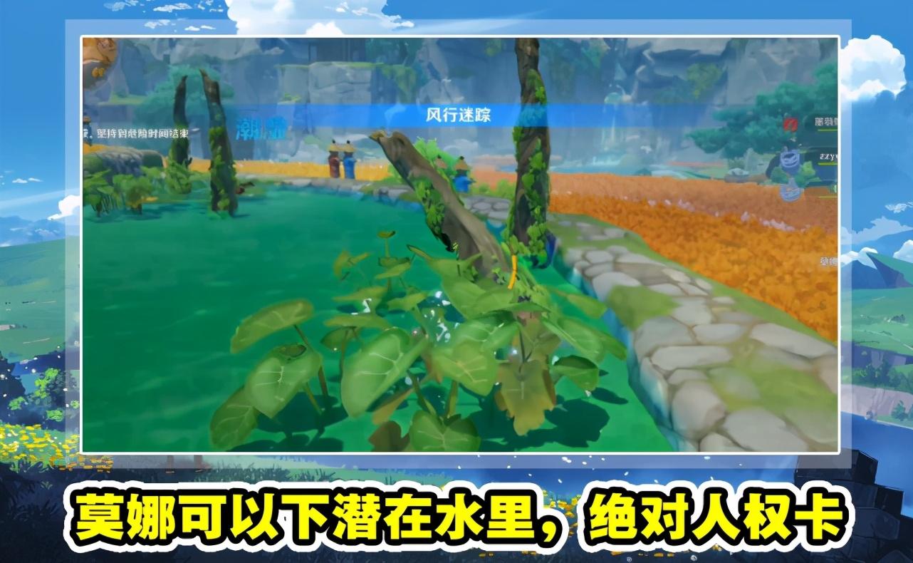 以上就是风行迷踪活动中,几处非常难找到的藏身点。值得一提的是,如果被猎人发现了也不要慌张,这时候我们可以靠操作跑路,因为猎人必须近身释放捕捉技能才能抓到游侠玩家,而且捕捉的范围并不大,所以我们可以选择卢姥爷、钟离、凯亚这些腿长的角色,他们的基础移速比腿短的角色更快,如果对方选择可莉当猎人,直接当她面绕圈圈,可莉都追不上。还有,莫娜是风行迷踪活动的绝对人权卡,她的冲刺技能可以下潜,只要不动还不消耗体力,比如像下图这样,直接藏在水里,很难看清。