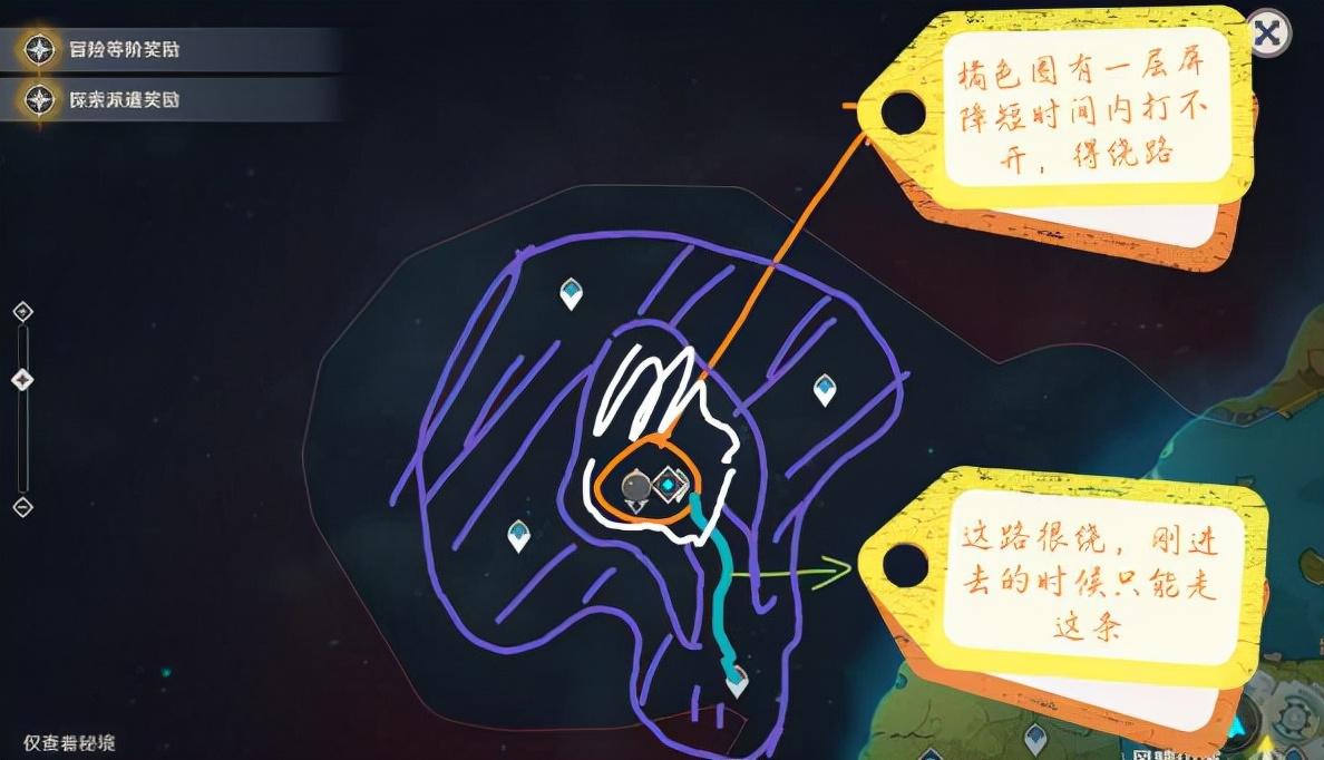 2、原神2.3风龙废墟入口玩家进入之后,需要在这里面解锁三个屏障,这三个屏障绿色的就是进去的路,但是这个路线非常的绕,屏障短时间不会解散,玩家可以在任务开启的时候回到入口的传送点,玩家时刻意在紫色的区域随便跑的,白色这里是有屏障的,玩家需要注意这些内容,不然很容易浪费时间。