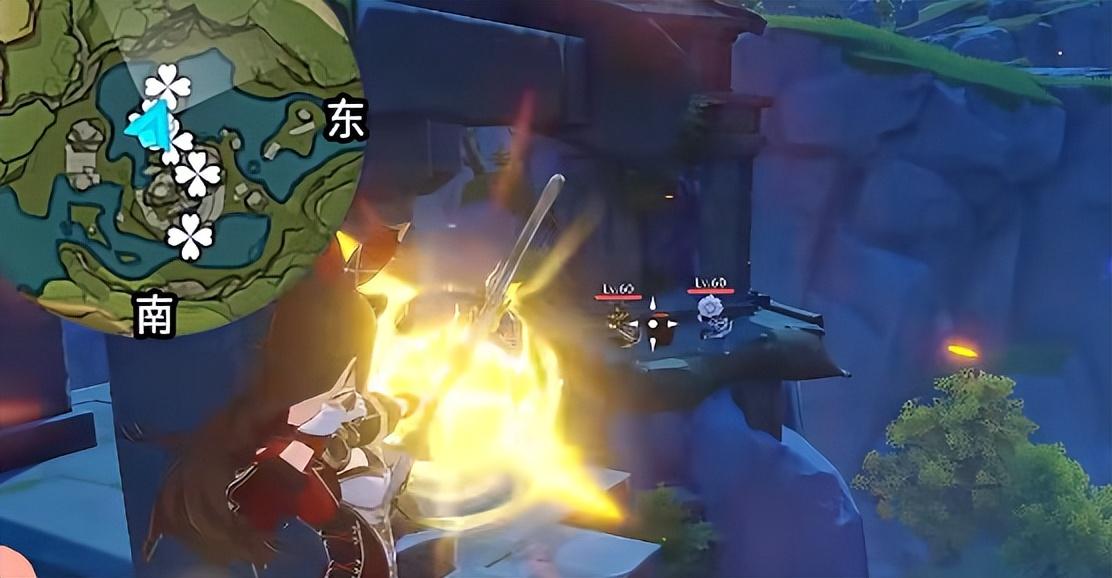 使用安柏攻击远处的炸药桶,然后飞到刚才炸药桶的位置。