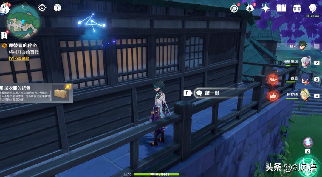 1.完成了「诡谲的御神签」后,来到稻妻城传送点,往冒险家协会方向走,楼梯处时被人撞一下(如果没触发,那先去神社抽签处与NPC对话,对话后调整时间至游戏内第二天白天,之后再走一遍这里)。