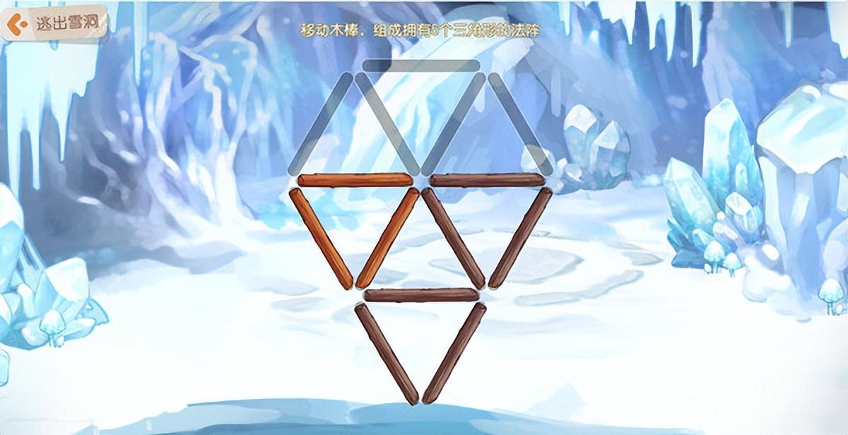2、在任务过程中有一个环节是逃出雪洞,玩家可以使用索菲亚曾经教过的方法,制作三角法阵。这里需要玩家移动木棒,组成拥有5个三角形的法阵。是一个需要玩家开动脑筋的益智小谜题。