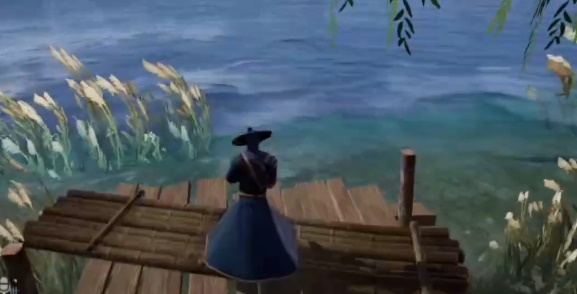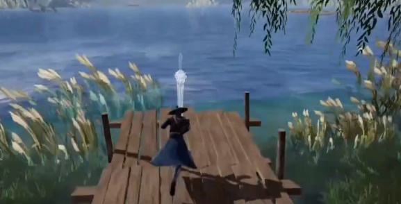 5、紧接着我们回到船夫这,在他旁边的木桥上制作竹筏,会有光剑指引。