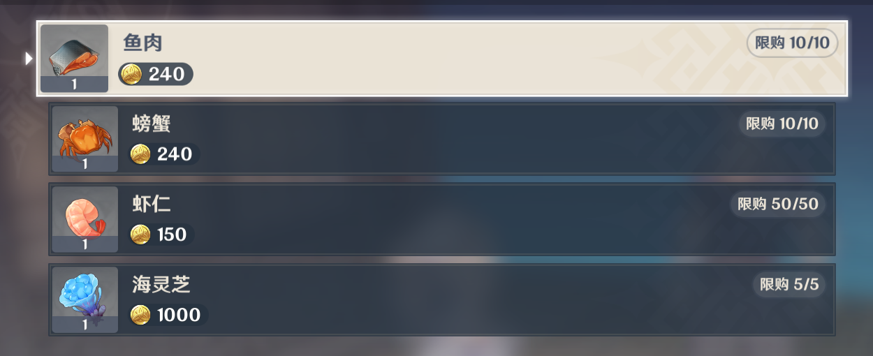 与该NPC对话,选择“我想买些鱼”选项,即可进入该NPC的商店界面。可以看到,在该NPC的商店中,每次刷新可以购买五个海灵芝。