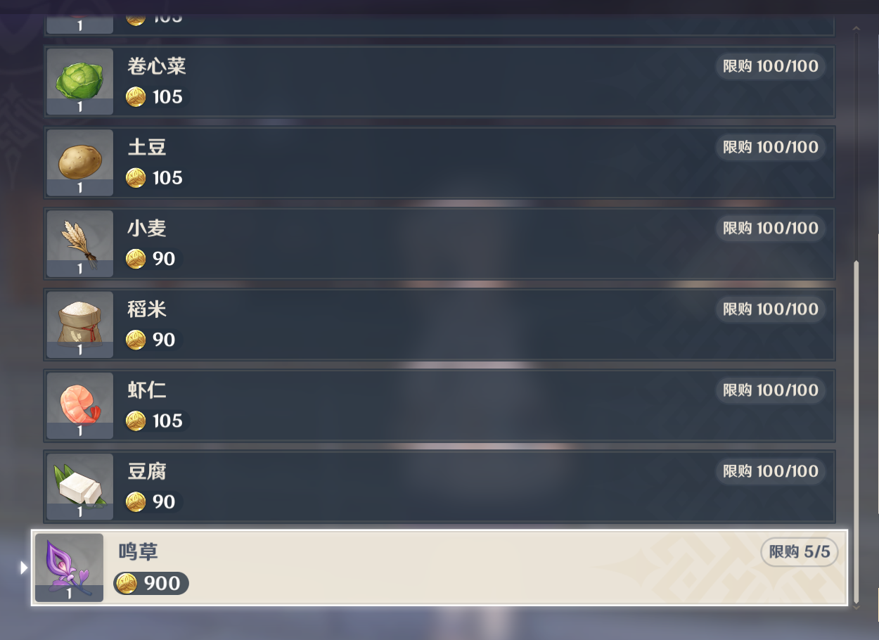 与该NPC对话,选择“我有想买的东西”选项,即可进入该NPC的商店界面。可以看到,在该NPC处可以每次刷新购买5个鸣草。