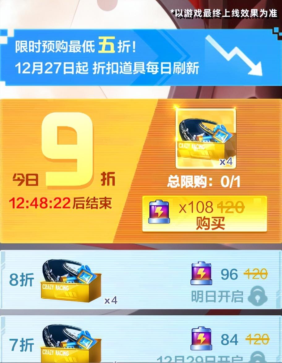 神秘钥匙 限时预购全新顶级竞速赛车【黑金甲虫】即将登场,宝宝特意为车友们准备了神秘钥匙折扣预购活动~12月27日-12月31日福利站开启【神秘钥匙预购】限时福利活动,活动期间车友们每天都能以折扣价购买神秘钥匙礼盒*4。预购活动共计5天,限时预购最低五折!车友们不要错过哦~