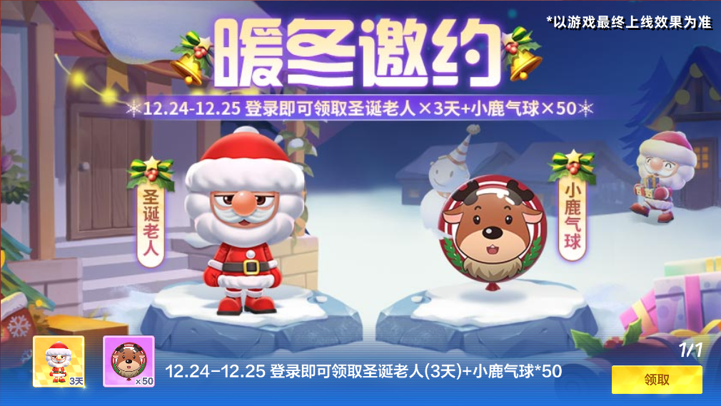 登录领好礼活动中心现已开启【暖冬邀约】登录领好礼活动,12月24日-12月25日,车友们登录游戏即可领取传说车手圣诞老人*3天和小鹿气球*50~