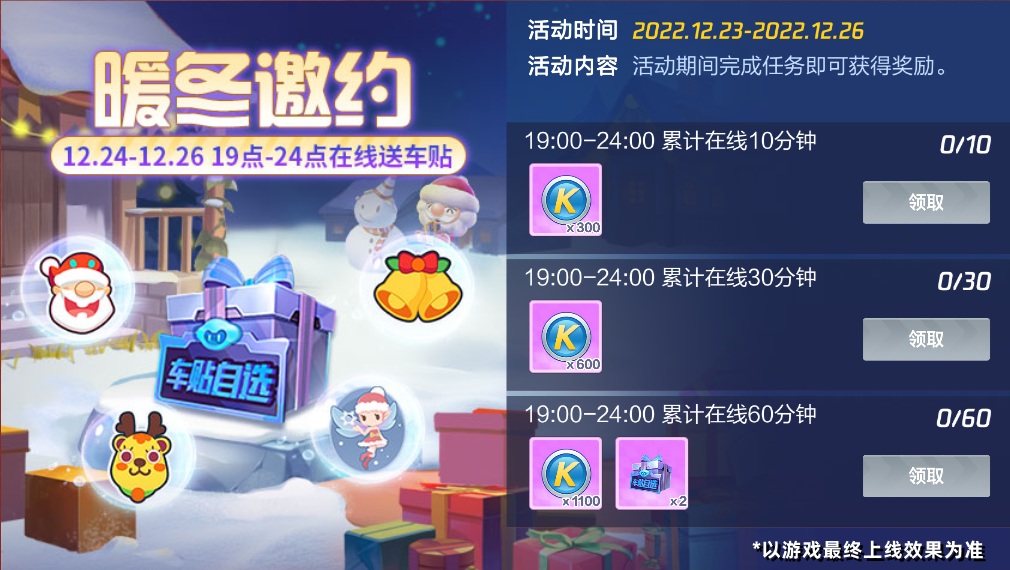 在线送车贴活动中心现已开启【暖冬邀约】在线送车贴活动,12月24日-12月26日,车友们每晚19点-24点累计在线时长即可领取酷币、车贴自选礼包~