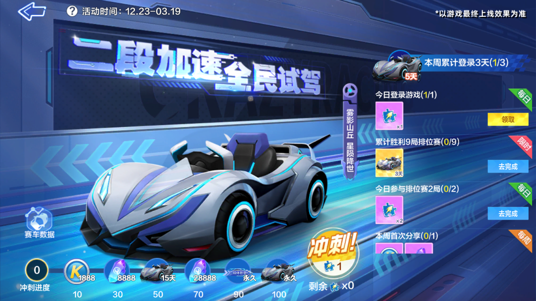 活动时间12.23-03.19完成任务即可免费领取搭载全新“自动二段加速”特性的传说级竞速赛车雾隐星陨,向着2023年全力出发!