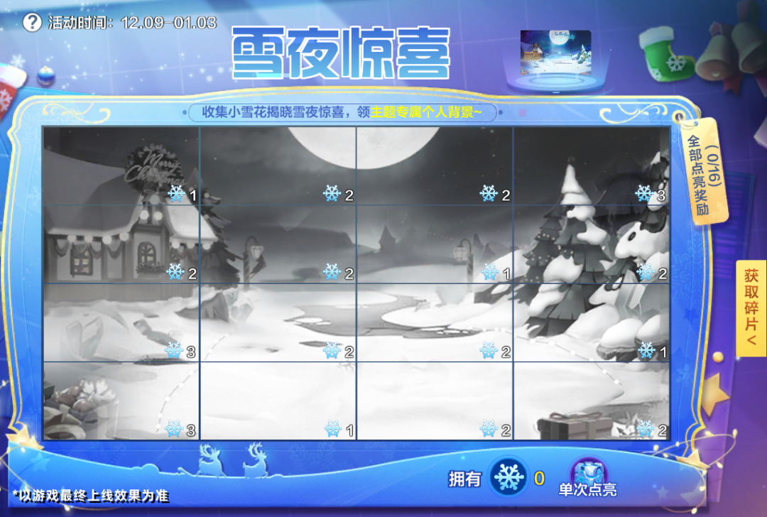 活动时间12.09-01.03活动期间收集小雪花碎片点亮拼图,揭晓雪夜惊喜,点亮拼图中的所有格子即可领取雪夜圣诞背景~