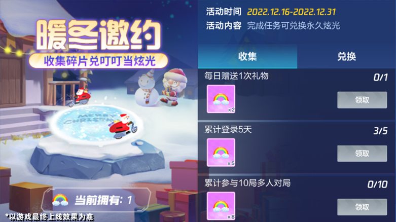 活动时间12.16-12.31活动期间完成指定任务可收集彩虹碎片,累计收集碎片达到一定数量即可兑换叮叮当炫光~
