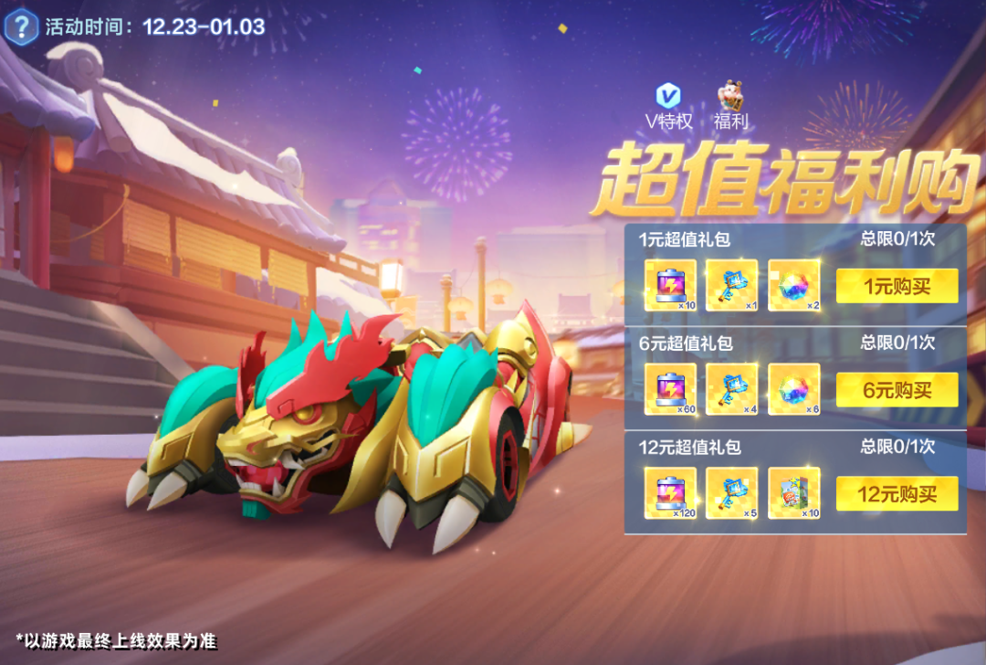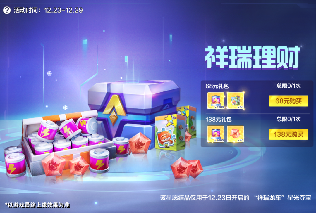 活动时间12.23-12.29活动期间可直购两档超值礼包,支付成功后可立即获得不同档位电池、宝宝礼物盒、祥瑞龙车星愿结晶礼包奖励。