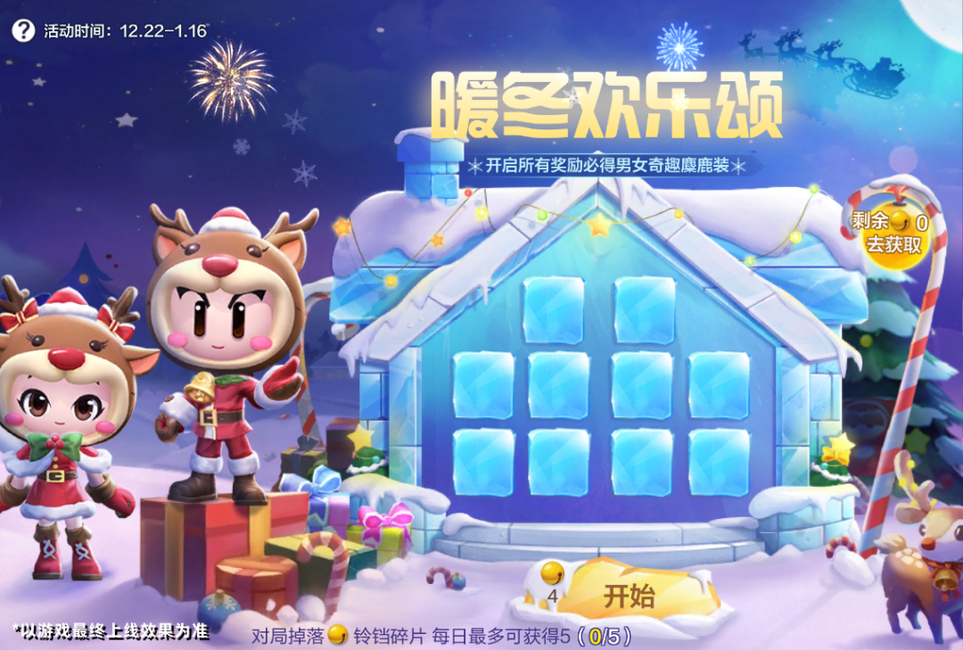 活动时间12.22-01.16活动期间收集铃铛碎片抽奖,即可获得包括奇趣麋鹿装(男)、奇趣麋鹿装(女)、电池、酷币等众多丰厚奖励~