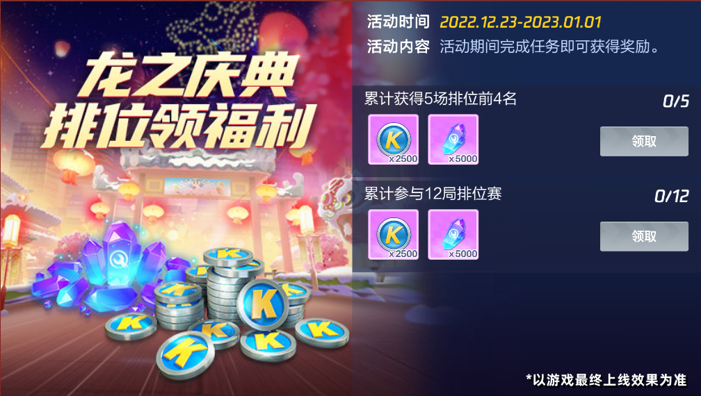 活动时间12.23-01.01全新S22龙之庆典主题赛季登场,活动期间完成对应排位任务即可领取大量酷币、能量水晶。