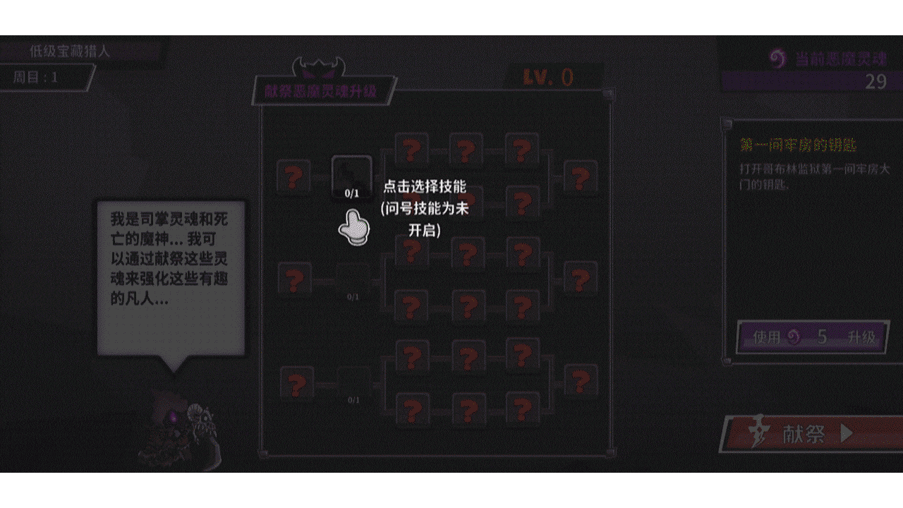 难度方面游戏同传统的Roguelike游戏一样,玩家死亡后装备和金币会全部丢失,但游戏也提供了两种难度供玩家选择。除此之外,游戏也具有独特的灵魂献祭玩法,每次击败怪物玩家都会获得一定的恶魔灵魂,玩家每次死亡,都可以用本局获得的恶魔灵魂解锁新的能力。你可以解锁新的技能,比如基础的攻击、防御、生命值等等。也可以用来提升你的装备,比如武器的选择等等。你可以选择战斗技能,也可以长期投入,让你在每一场战斗中都能得到更多的金币和灵魂,解锁更多的新技能。你不会因为一次又一次的失败而感到灰心丧气,你可以明显地感受到自己在不断地增强。让你可以更容易地去对付更多的强敌,去探索更深处的城堡,积累更多的经验,而不会再一次的失败。