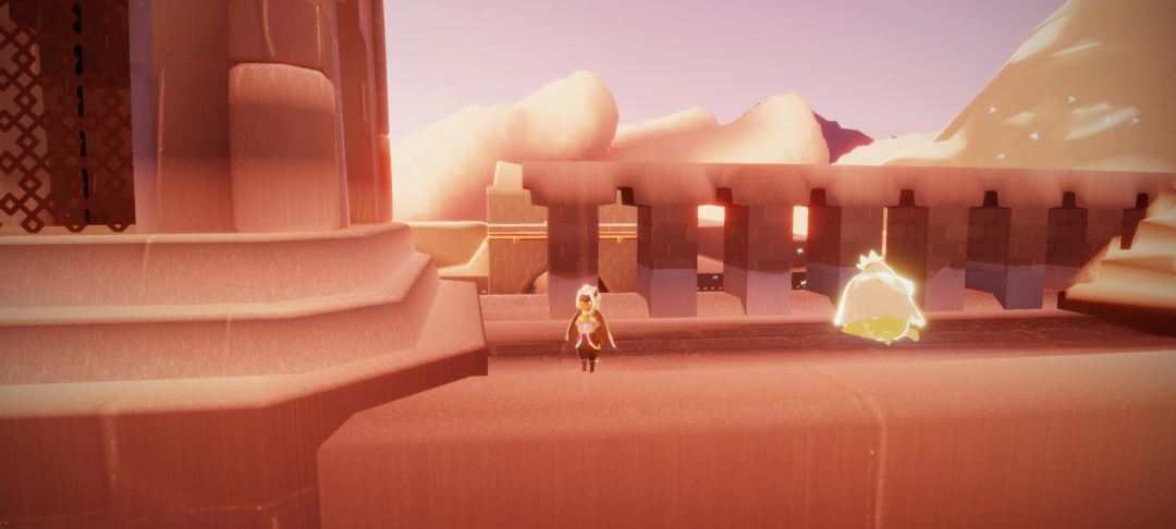 任务二:“在霞谷重温先祖的美好回忆”,该先祖的位置在霞谷的霞光城,穿过拱门之后直接看向前方的拱桥平台上就能看到这个先祖了。这个先祖指引很简单,直接顺着路往上。