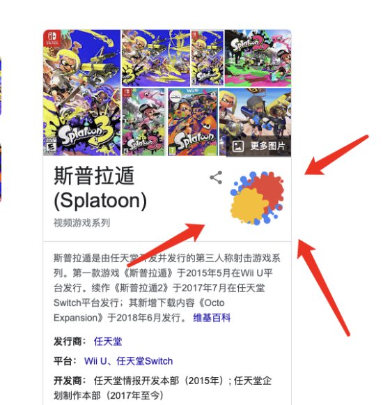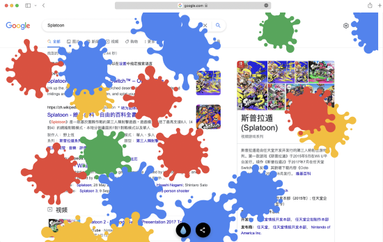 近日,谷歌搜索页面出现了一个关于《喷射战士》的小彩蛋:在Google搜索“斯普拉遁”“Splatoon”,然后点击右侧游戏介绍区域的彩色喷墨图标,就可以使用鼠标点击在网页各处随意“喷射”彩色墨水。
