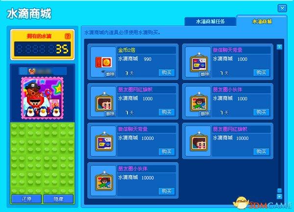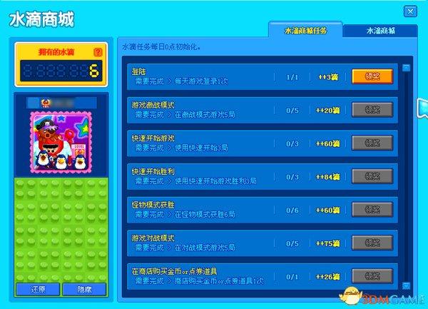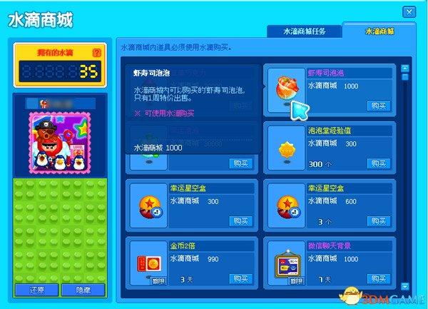 《泡泡堂》全新企划——水滴商城!每天在游戏中完成任务收集水滴,即可在水滴商城中兑换各种丰富的游戏道具。完成指定任务后,领奖按钮将会开启,点击领取即可获得相对应的水滴。水滴商城右上方可以切换进入水滴商城购买页面,页面中只能使用水滴来进行道具的购买,右边会显示穿着效果。不见有大量经典道具,还有各种新品不定期出没吧哦,快去收集水滴兑换吧!