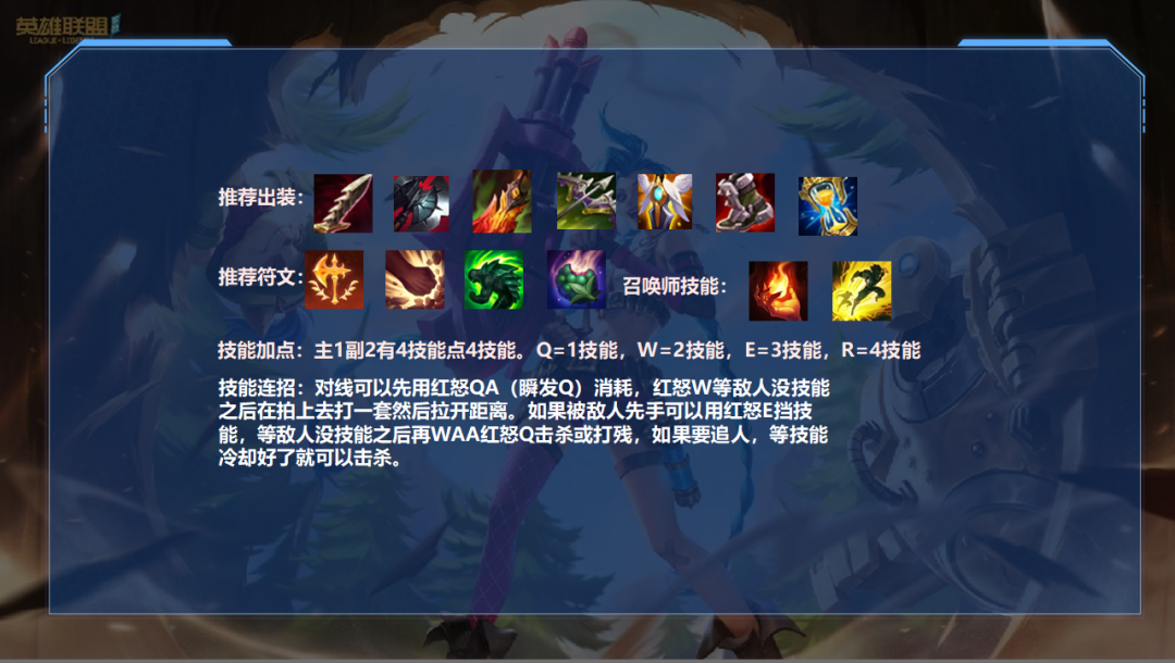 对线可以先用红怒QA(瞬发Q)消耗,红怒W等敌人没技能之后在拍上去打一套然后拉开距离。如果被敌人先手可以用红怒E挡技能,等敌人没技能之后再WAA红怒Q击杀或打残,如果要追人,等技能冷却好了就可以击杀。