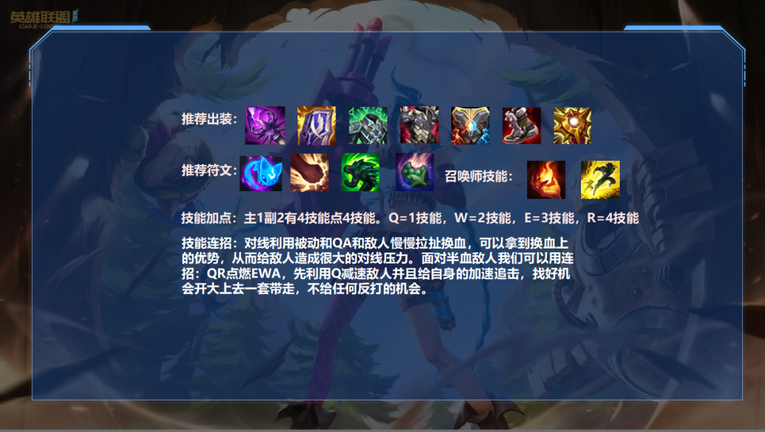 对线利用被动和QA和敌人慢慢拉扯换血,可以拿到换血上的优势,从而给敌人造成很大的对线压力。面对半血敌人我们可以用连招:QR点燃EWA,先利用Q减速敌人并且给自身的加速追击,找好机会开大上去一套带走,不给任何反打的机会。