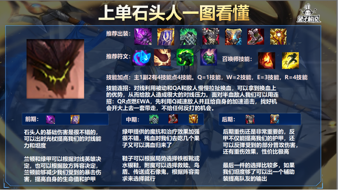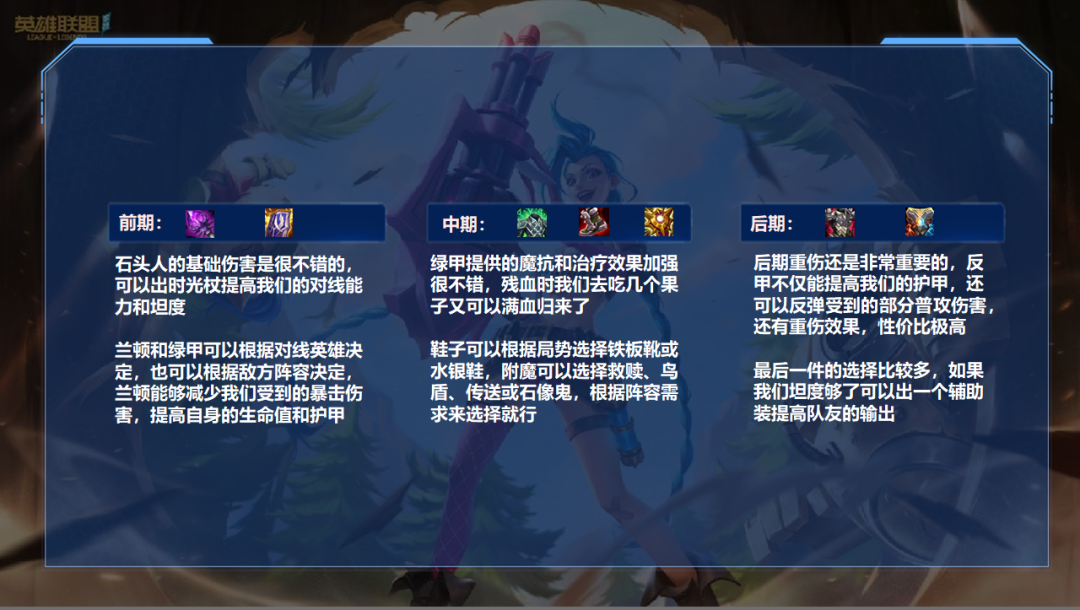 上单石头人可以不用纯肉,那样会比较依赖队友,但是也不能纯AP,那样队伍会没有前排,一打团就被冲烂,我们可以用两边都掺一点。