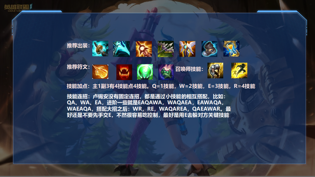 卢锡安没有固定连招,都是通过小技能的相互搭配,比如:QA、WA、EA,进阶一些就是EAQAWA,WAQAEA,EAWAQA,WAEAQA,搭配大招之后:WR,RE,WAQAREA,QAEAWAR。最好还是不要先手交E,不然很容易吃控制,最好是用E去躲对方关键技能