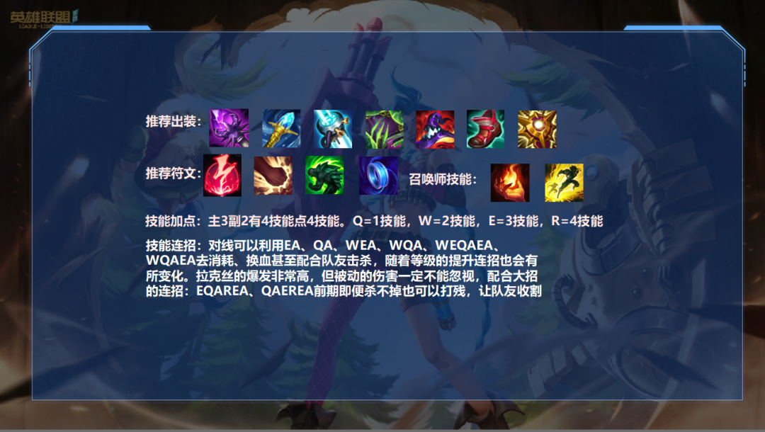 对线可以利用EA、QA、WEA、WQA、WEQAEA、WQAEA去消耗、换血甚至配合队友击杀,随着等级的提升连招也会有所变化。拉克丝的爆发非常高,但被动的伤害一定不能忽视,配合大招的连招:EQAREA、QAEREA前期即便杀不掉也可以打残,让队友收割