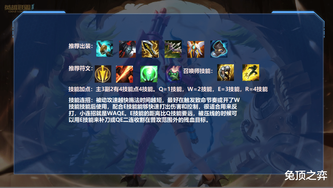 被动攻速越快施法时间越短,最好在触发致命节奏或开了W技能技能后使用,配合E技能能够快速打出伤害和控制,很适合用来反打,小连招就是WAQE。E技能的距离比Q技能要远,被压线的时候可以用E技能来补刀或QE二连收割在普攻范围外的残血目标。