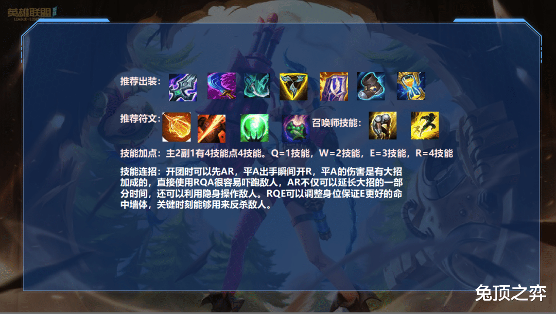 三件后根据局势选择出装,敌人吸血多需要重伤就及时出轻语,越早越好。敌人物理伤害高就出兰顿,能够提高极大的容错。三项经过加强后属性也很不错,不需要容错也可以出三项。其次火炮、日轮刀、死舞都可以选择,但是最好不要出复活甲,薇恩不太需要攻击力,复活起来大招的隐身没了,敌人如果守着尸体,起来还是被秒,不如买个兰顿提高容错来的实在。