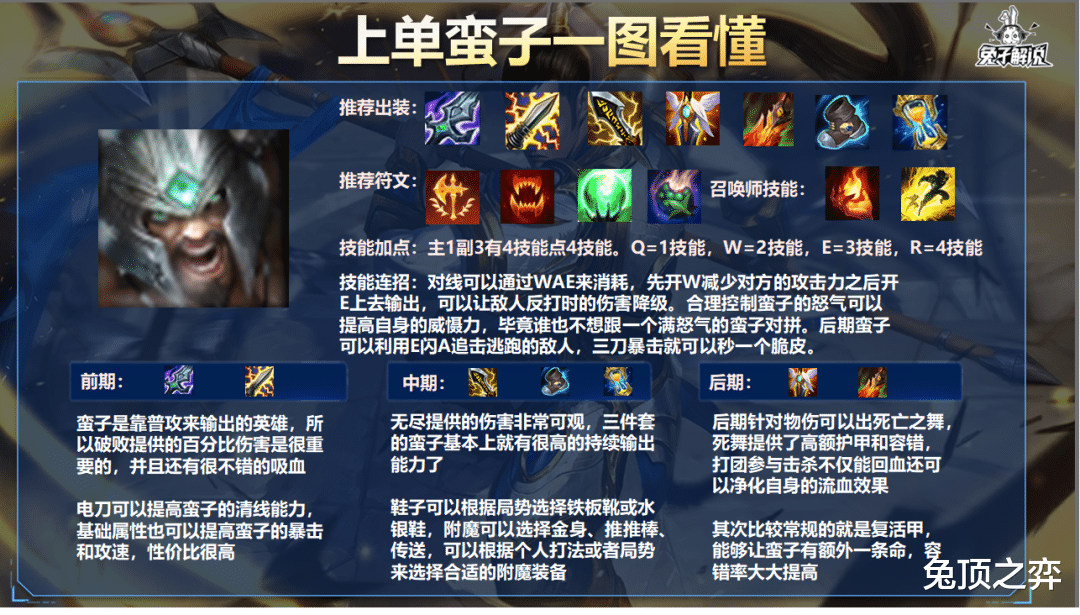 蛮子的出装更偏向暴击,因为蛮子机制的原因,暴击可以大幅减少E技能的CD,让蛮子更加灵活,所以前三件套最少得让蛮子暴击率在50及以上。电刀并不是固定的,如果觉得需要容错也可以换成绿叉,需要伤害也可以换成太阳刀。后两件可以选择的出装更多了,只是比较常规的就是复活甲和死舞,能提供很高的容错,其他也可以选择:迅刃、三项、破舰者、饮血剑、轻语或者其他防御装。