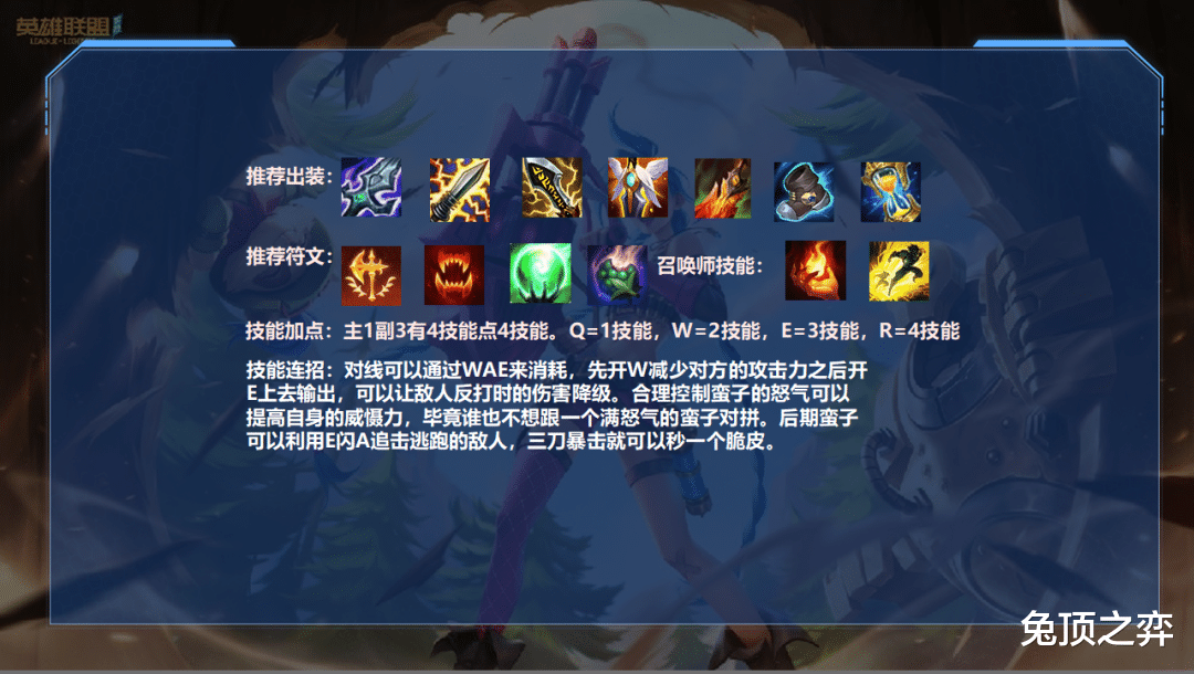 对线可以通过WAE来消耗,先开W减少对方的攻击力之后开E上去输出,可以让敌人反打时的伤害降级。合理控制蛮子的怒气可以提高自身的威慑力,毕竟谁也不想跟一个满怒气的蛮子对拼。后期蛮子可以利用E闪A追击逃跑的敌人,三刀暴击就可以秒一个脆皮。