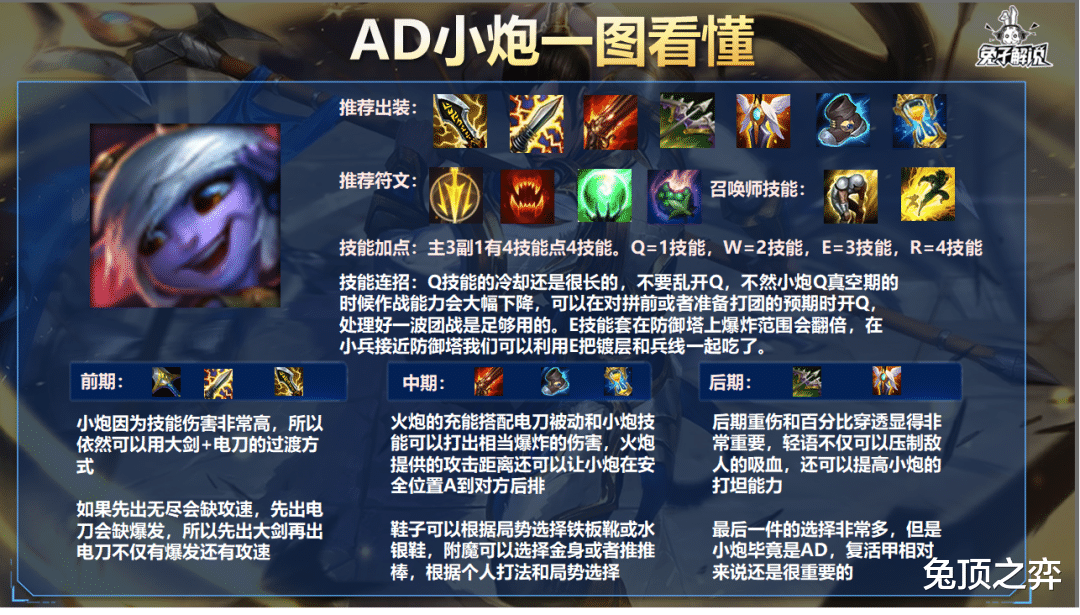 那么很多高手就会问了,为什么选择电刀。电刀能够提高小炮的清线、刷野和推塔速度,能够无限滚雪球,从而加快自身的装备成型速度,伤害方面也是丝毫不逊色于其他暴击装。