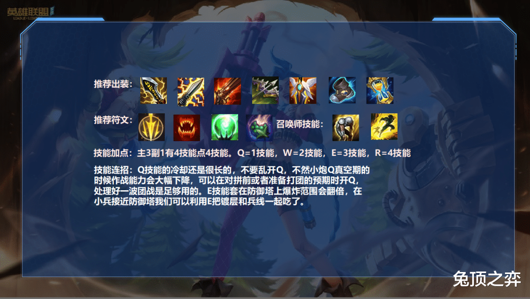 Q技能的冷却还是很长的,不要乱开Q,不然小炮Q真空期的时候作战能力会大幅下降,可以在对拼前或者准备打团的预期时开Q,处理好一波团战是足够用的。E技能套在防御塔上爆炸范围会翻倍,在小兵接近防御塔我们可以利用E把镀层和兵线一起吃