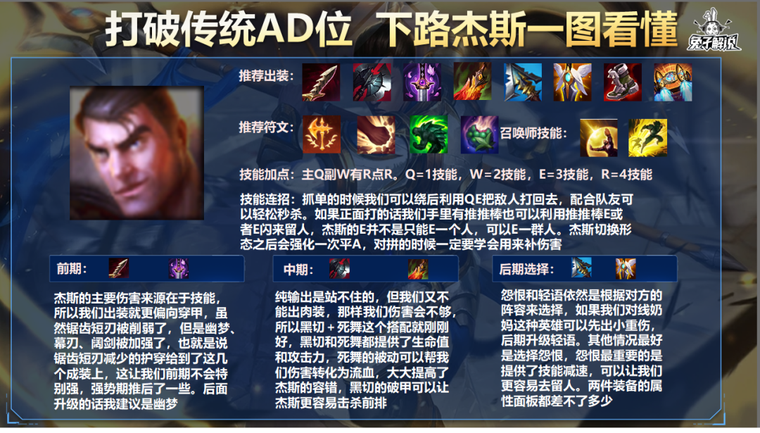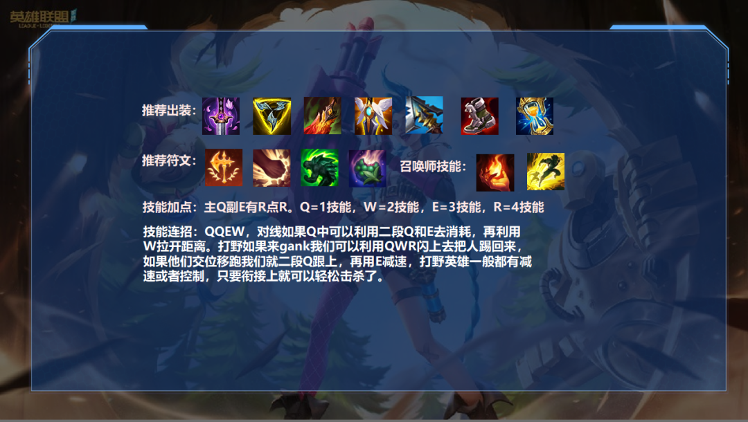 QQEW,对线如果Q中可以利用二段Q和E去消耗,再利用W拉开距离。打野如果来gank我们可以利用QWR闪上去把人踢回来,如果他们交位移跑我们就二段Q跟上,再用E减速,打野英雄一般都有减速或者控制,只要衔接上就可以轻松击杀了。