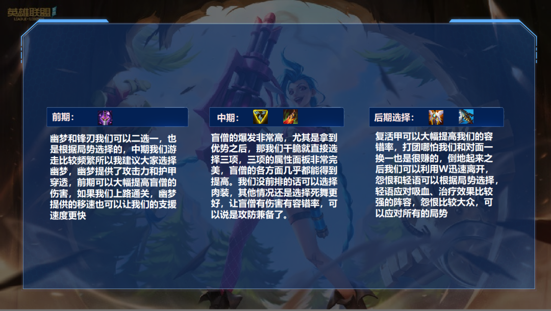 我们的出装可以根据局势和对方阵容来调整,比如对方爆发高或者控制多,我们第一件可以出锋刃,锋刃提供的伤害并不比幽梦差,但是容错率要比幽梦高很多,黑切也是同理,可以替换三项,如果我方队伍没有前排的话,我们后面要全补肉,尽量能给队友抗一下伤害,不然打团的时候五个人都会非常难受。其他正常局势的话我们可以出死舞、复活甲、怨恨,这三件套目前来说效果是非常不错的,轻语可以替换怨恨,血手可以替换死舞,补肉也可以把怨恨/轻语换成兰顿/自然之力。鞋子可以根据局势选择铁板靴和水银鞋,附魔我个人喜欢选择金身,当然了也可以选石像鬼、救赎、鸟盾、传送