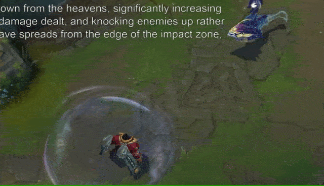 R:召唤流星砸向地面,造成伤害并眩晕敌人,每命中一名敌人就会产生一份星尘。星尘会提升该技能的范围,当他收集到75枚星尘后,下一次流星会升级为天瀑,天瀑会召唤更大的流星撞击地面,极大提升范围的同时,伤害也会更高,并且将眩晕效果升级为击飞,而撞击地面后会产生冲击波,冲击波会持续向外扩散,被波及的敌人会受到伤害和减速,星尘同样会提升撞击的范围规模。