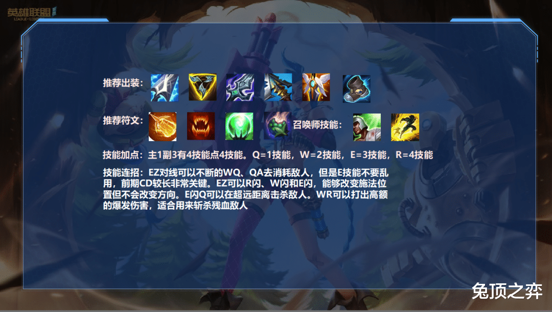 EZ对线可以不断的WQ、QA去消耗敌人,但是E技能不要乱用,前期CD较长非常关键。EZ可以R闪、W闪和E闪,能够改变施法位置但不会改变方向。E闪Q可以在超远距离击杀敌人。WR可以打出高额的爆发伤害,适合用来斩杀残血敌人