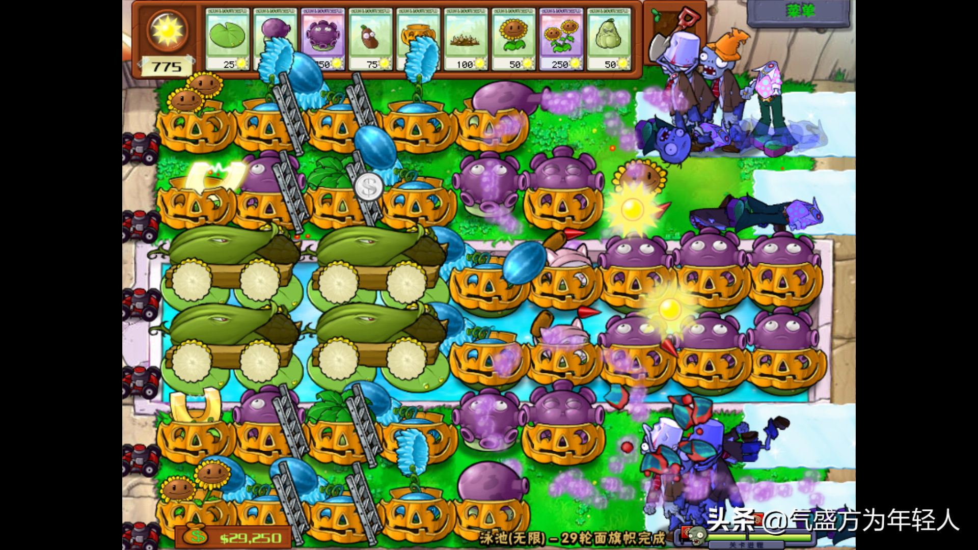 注意,第8、9路植物上的梯子是整个阵型的灵魂,可以说这个阵型享受的就是让僵尸竖梯子的过程,因为只要梯子竖好了,轻松几千轮,只要时间足够,可以一直玩下去。