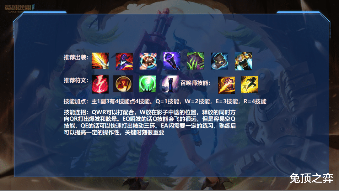 QWR可以打配合,W放在影子中途的位置,释放的同时方向QR打出爆发和眩晕。EQ瞬发的话Q技能会飞的很远,但是容易空Q技能,QE的话可以快速打出被动三环。EA闪需要一定的练习,熟练后可以提高一定的操作性,关键时刻很重要