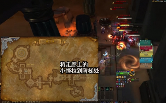 由于挖掘场至地图厅前的大厅走廊视角较差,小怪会频繁读条地板技能,坦克可以选择卡视角,拉到所有小怪的仇恨,在地图厅的台阶处卡视角处理这波小怪。
