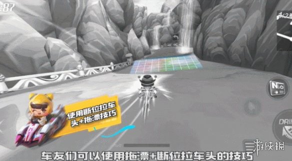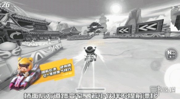桥面后方道路变窄,若小伙伴不提前漂移,会撞到桥后方的墙壁,因此车友们需要提前向右漂移,利用腾空和落地集气技巧,快速通过。